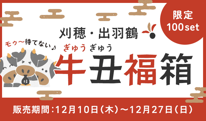「モゥ~待てない!出羽鶴・刈穂ぎゅうぎゅう(牛丑)福箱」オンラインショップ限定発売中
