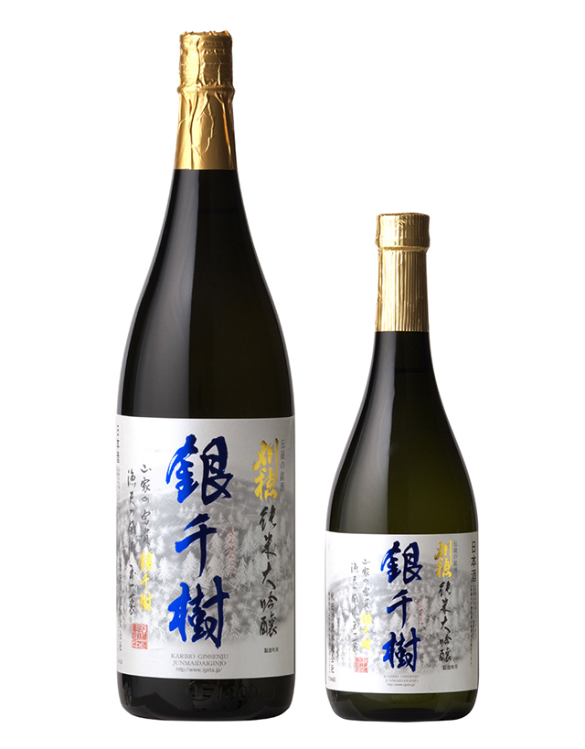 「山家の富貴銀千樹」山里には格別誇れるものはないが、雪をかぶって白銀に光る山々の樹林の風情こそ素晴らしい宝物だ”という意味。刈穂蔵周辺の雪景色のような透明感のある華やかな香りときれいに広がる味わいが特徴です。